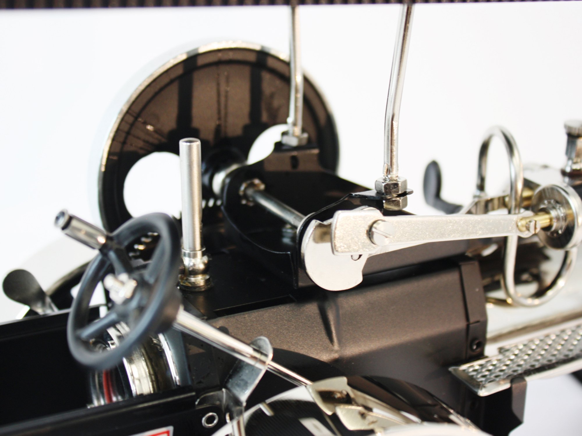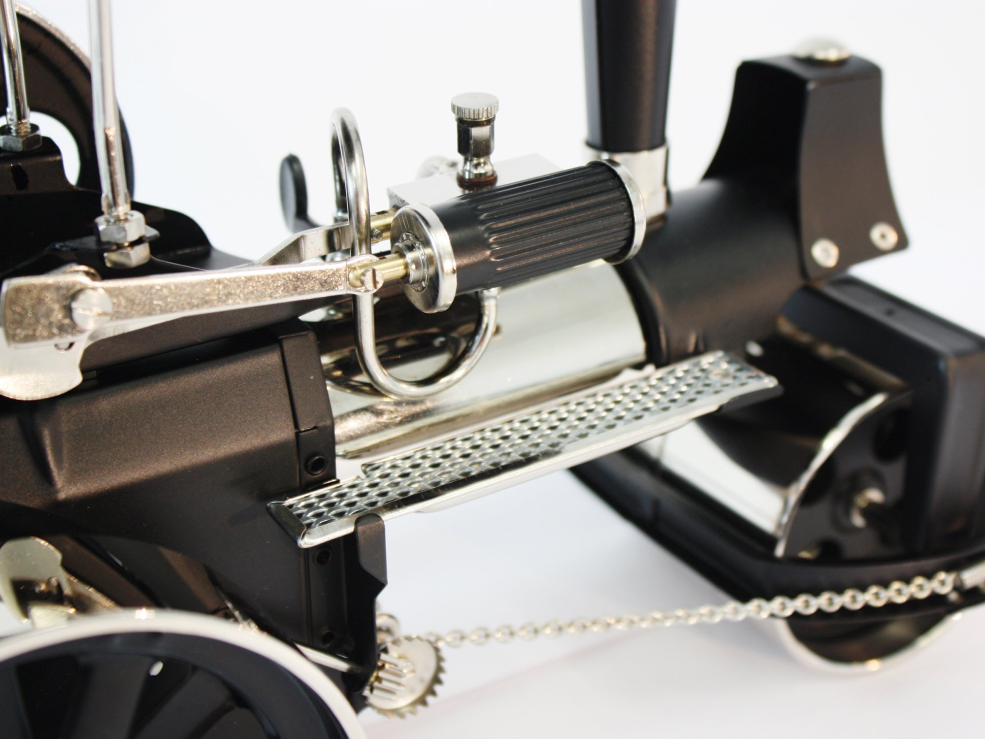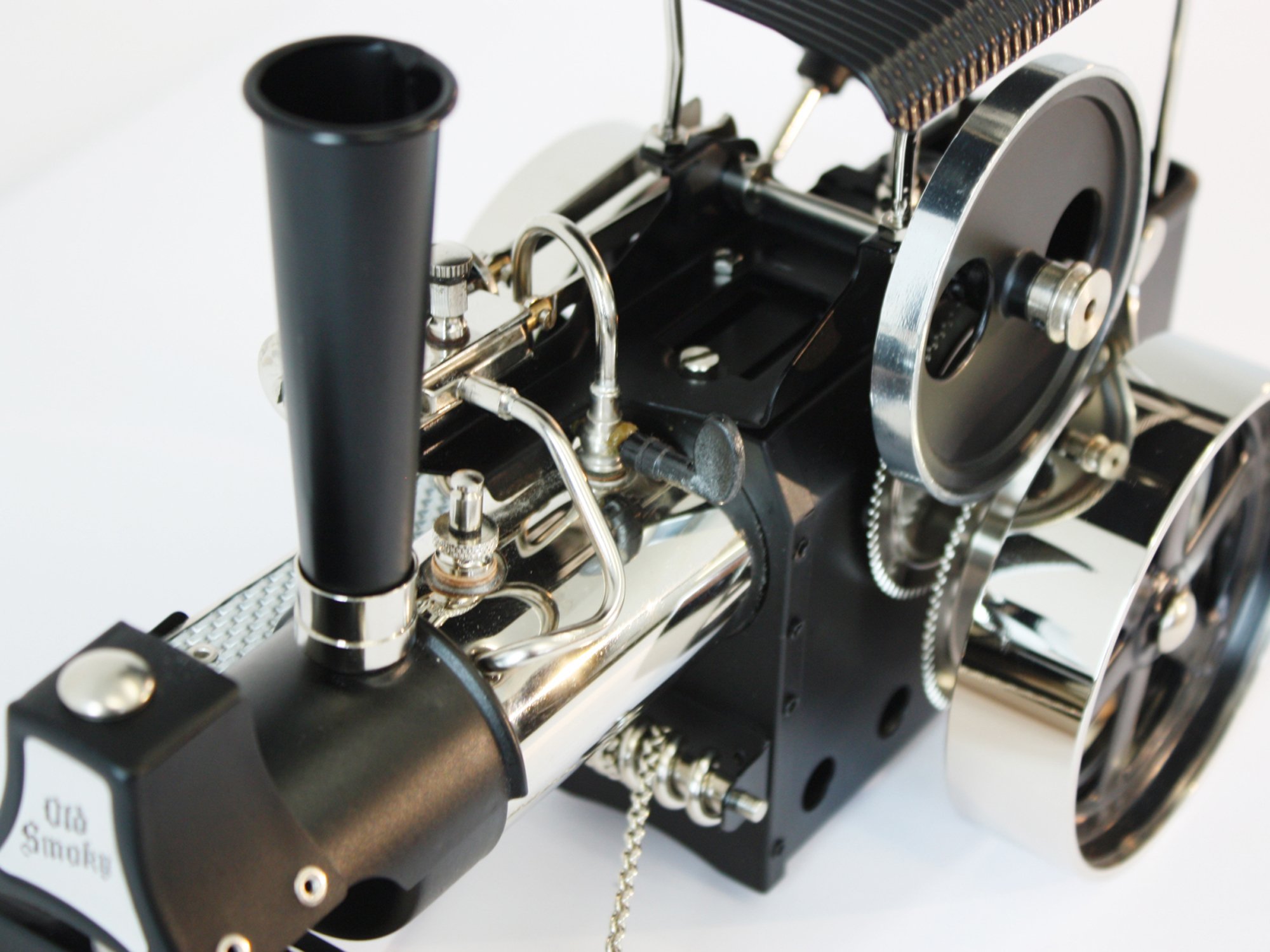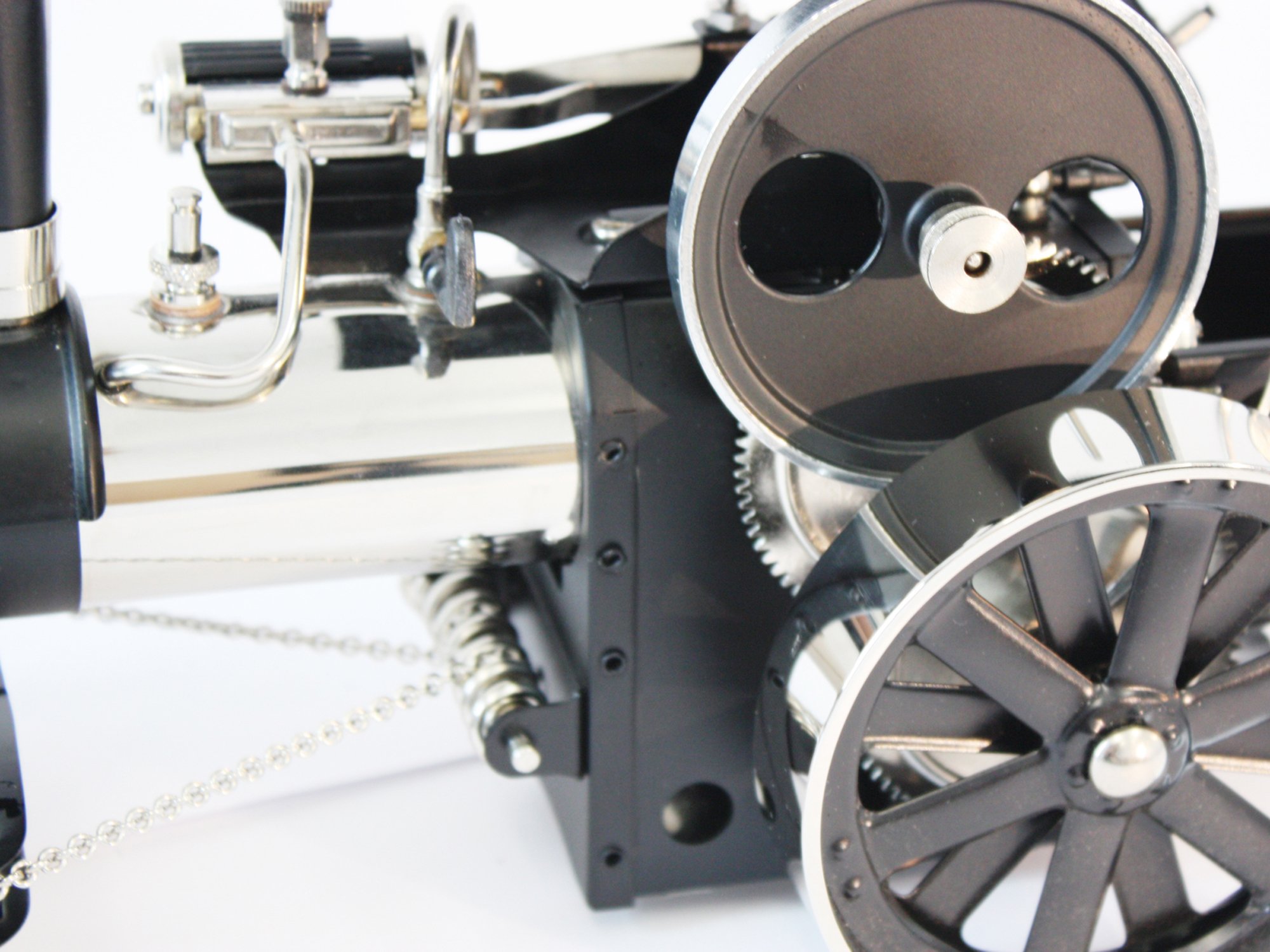 Laufsteg, Kettenlenkung und Getriebekupplung sind selbstverständliche Details unserer Old Smoky (schwarz/ nickel). Die Kupplung - links neben dem Führerstand durch eine Stange zu bedienen - ermöglicht, dass die Dampfwalze auch als ortsfeste Dampfmaschine betrieben werden kann. Dabei ist die Old Smoky mit ihrem 230 ccm Kessel stark genug, um sowohl im mobilen Betrieb Zubehör zu ziehen als auch im stationären Betreib Antriebsmodelle anzutreiben. Die Aluminium-Walzenräder dieses Dampfrollers sind eloxiert und lackiert.