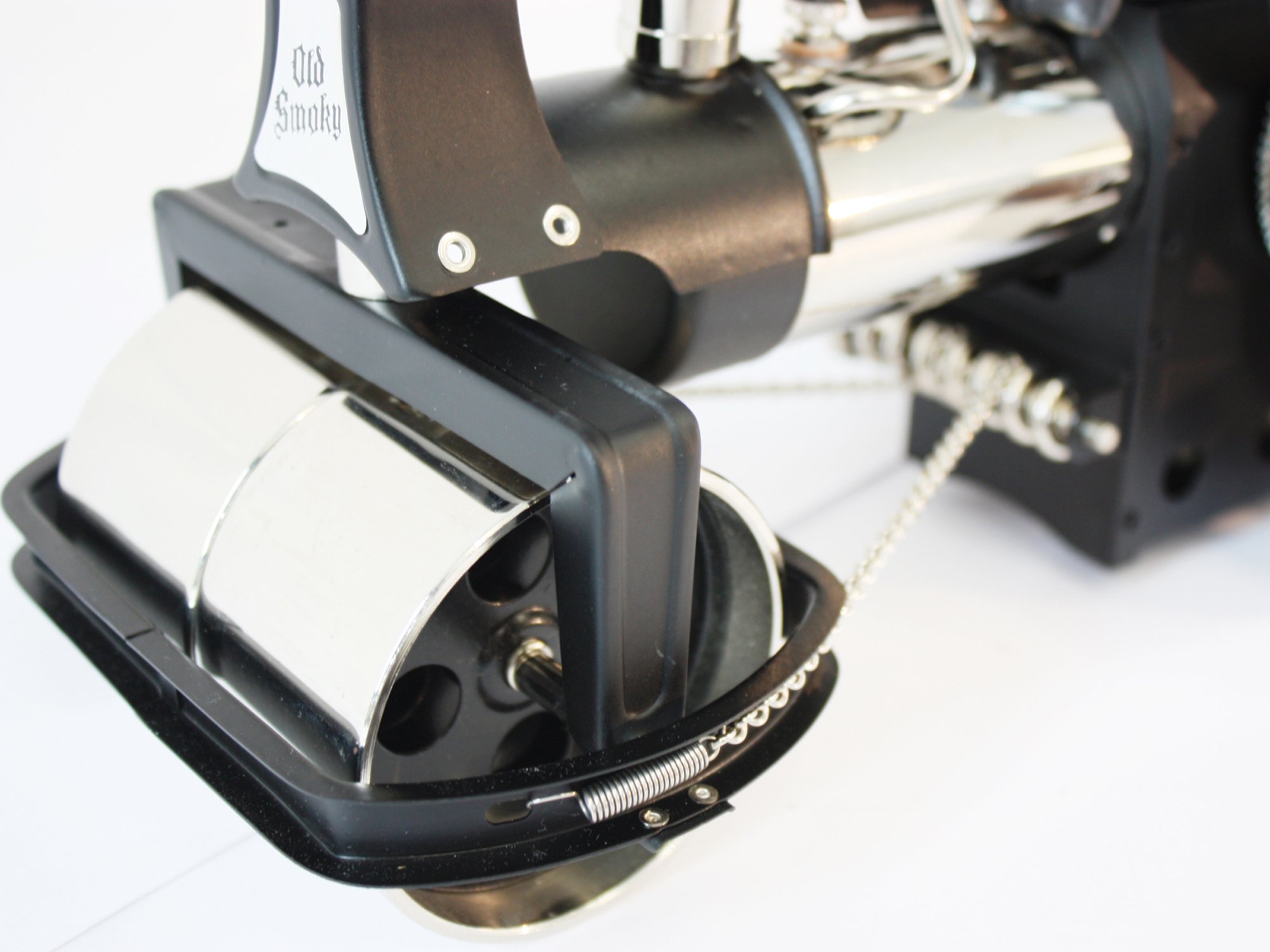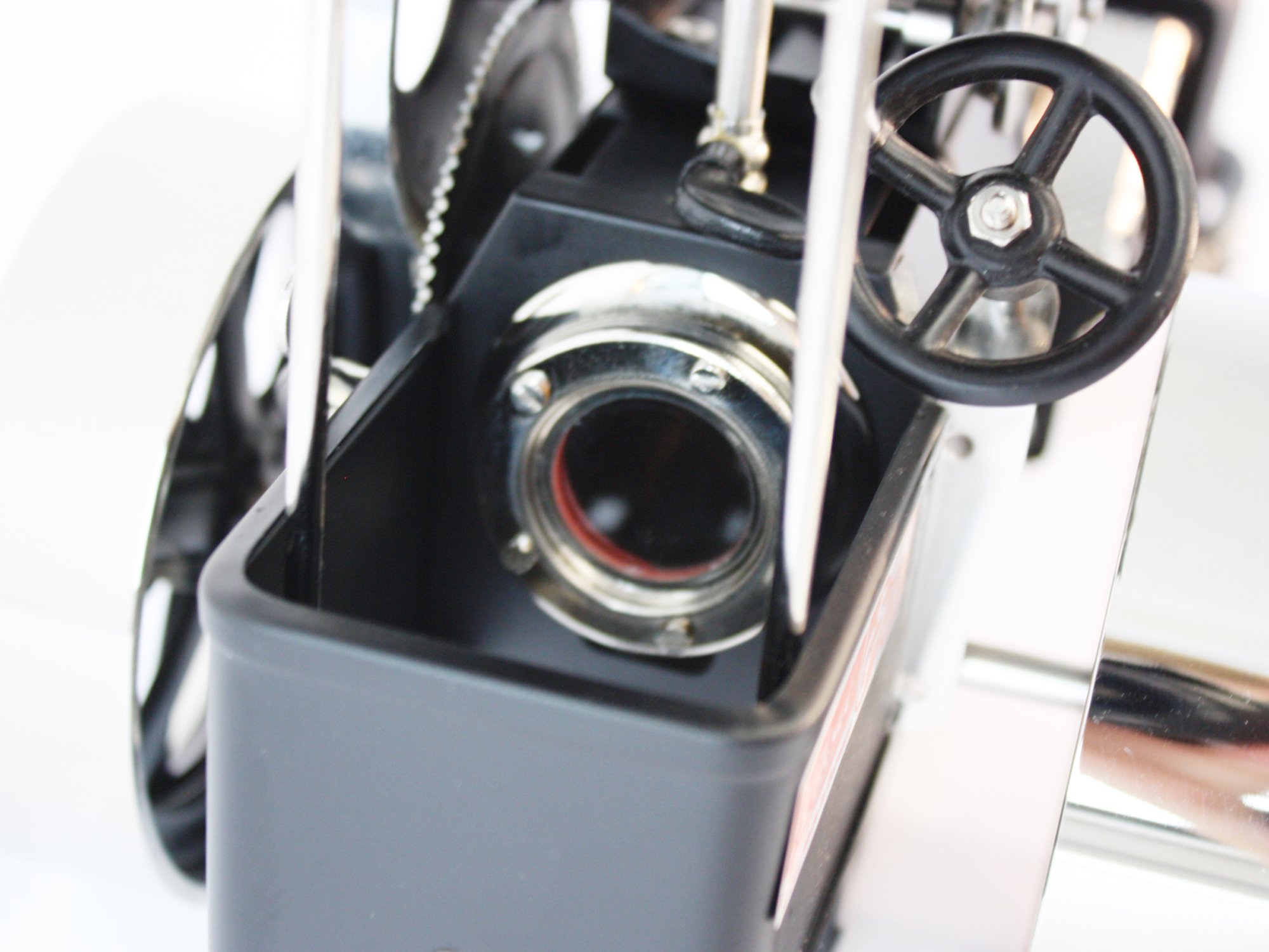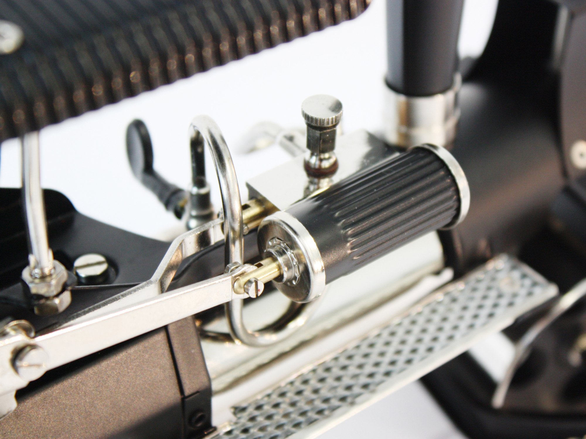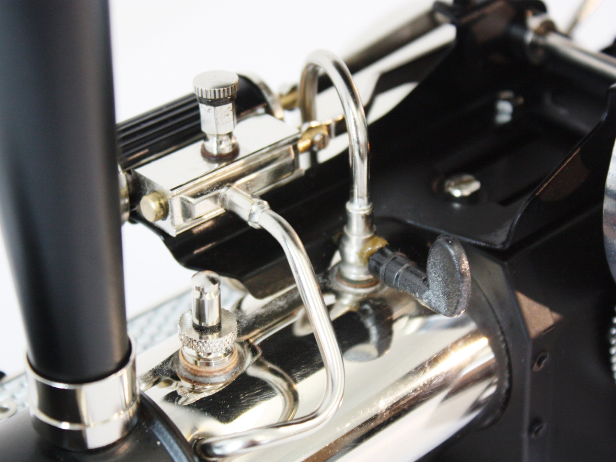 Laufsteg, Kettenlenkung und Getriebekupplung sind selbstverständliche Details unserer Old Smoky (schwarz/ nickel). Die Kupplung - links neben dem Führerstand durch eine Stange zu bedienen - ermöglicht, dass die Dampfwalze auch als ortsfeste Dampfmaschine betrieben werden kann. Dabei ist die Old Smoky mit ihrem 230 ccm Kessel stark genug, um sowohl im mobilen Betrieb Zubehör zu ziehen als auch im stationären Betreib Antriebsmodelle anzutreiben. Die Aluminium-Walzenräder dieses Dampfrollers sind eloxiert und lackiert.