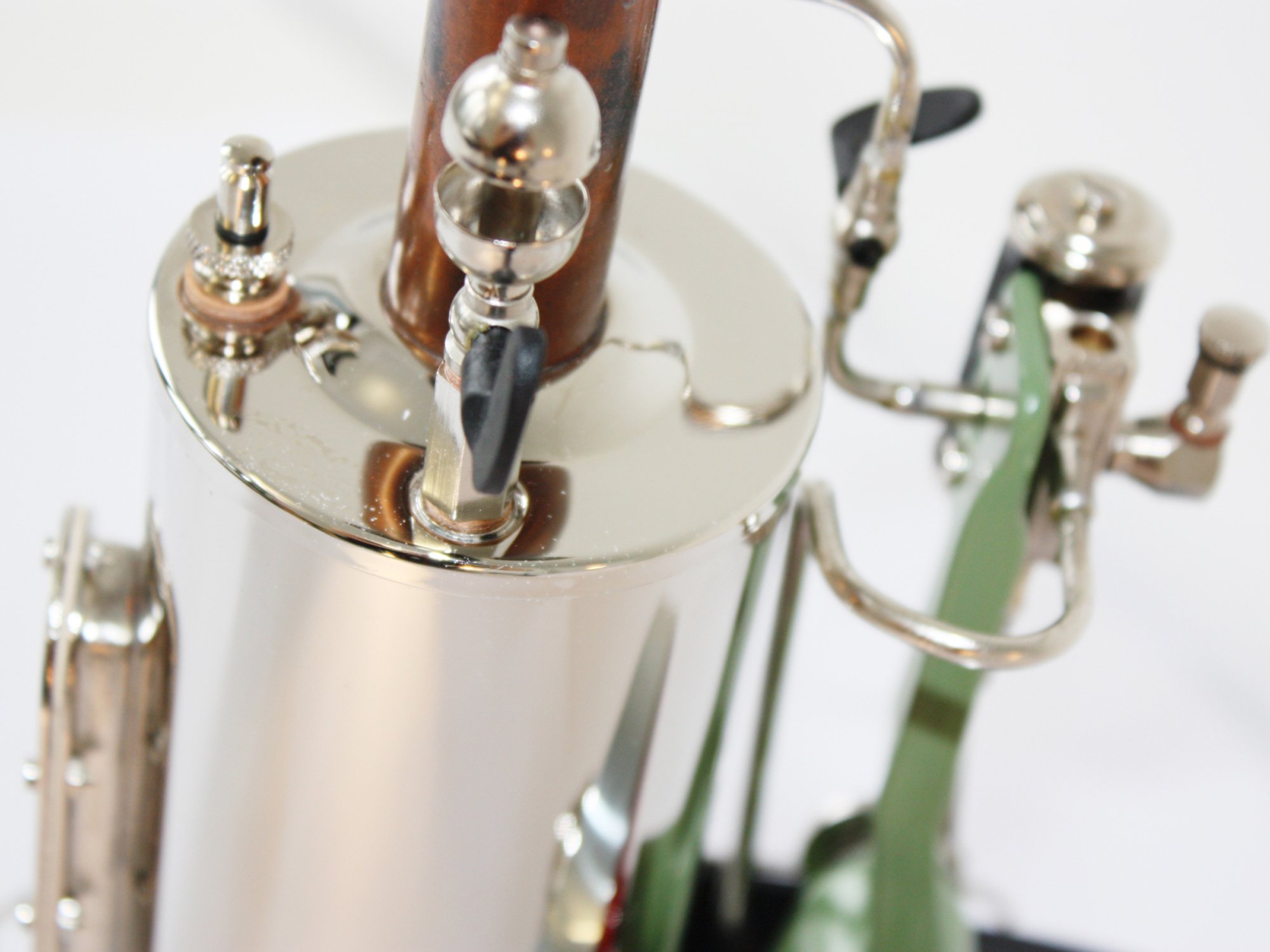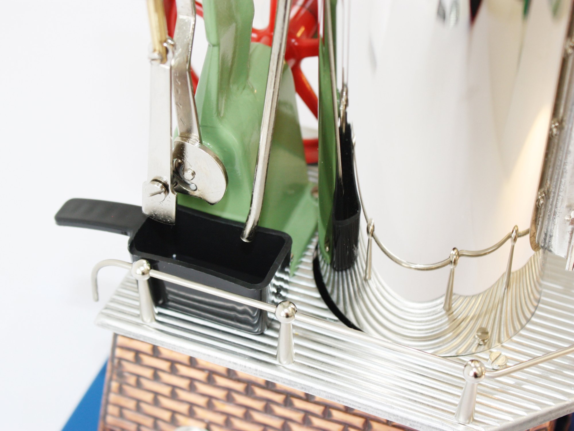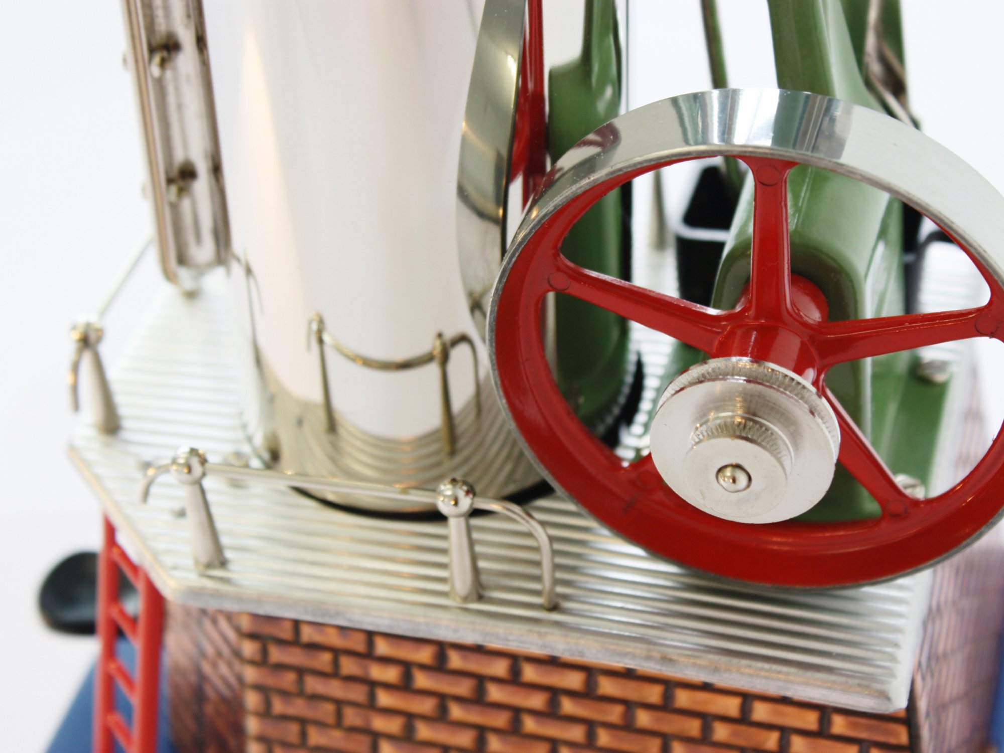 This engine persuades with its compact construction. A fire tube inside the boiler ensures a quick pressure generation. In contrast to most of the Wilesco engines it is equipped with an upright assembly.