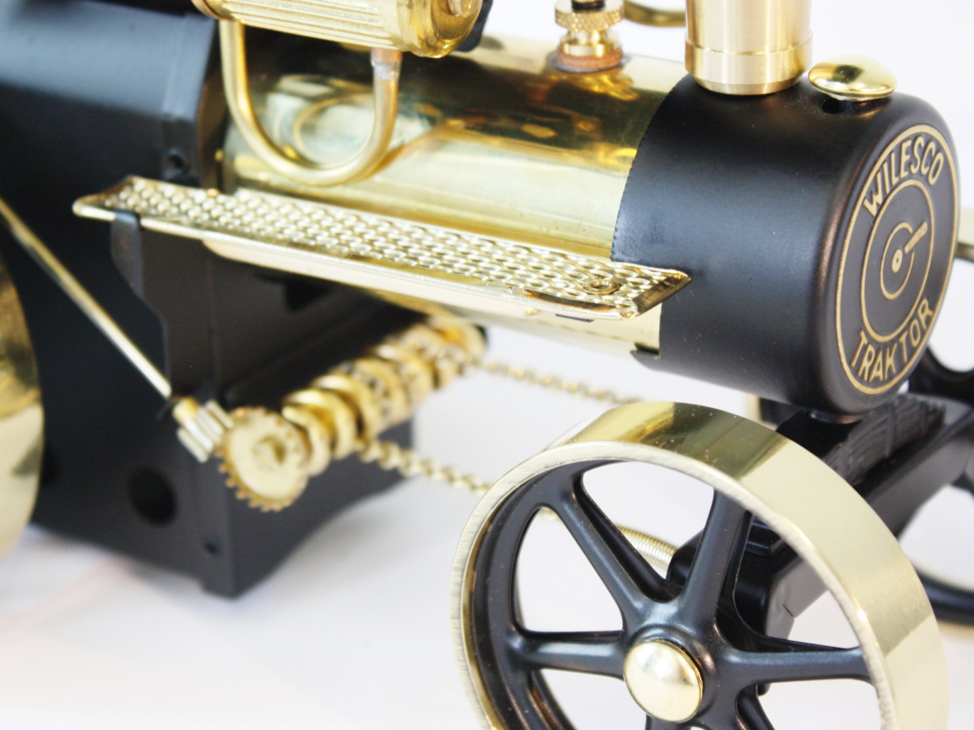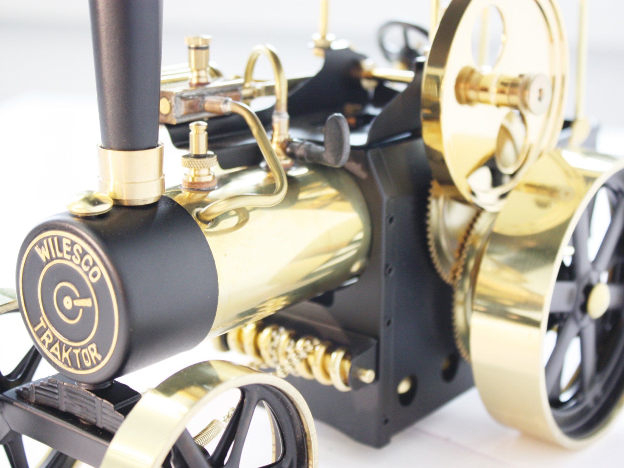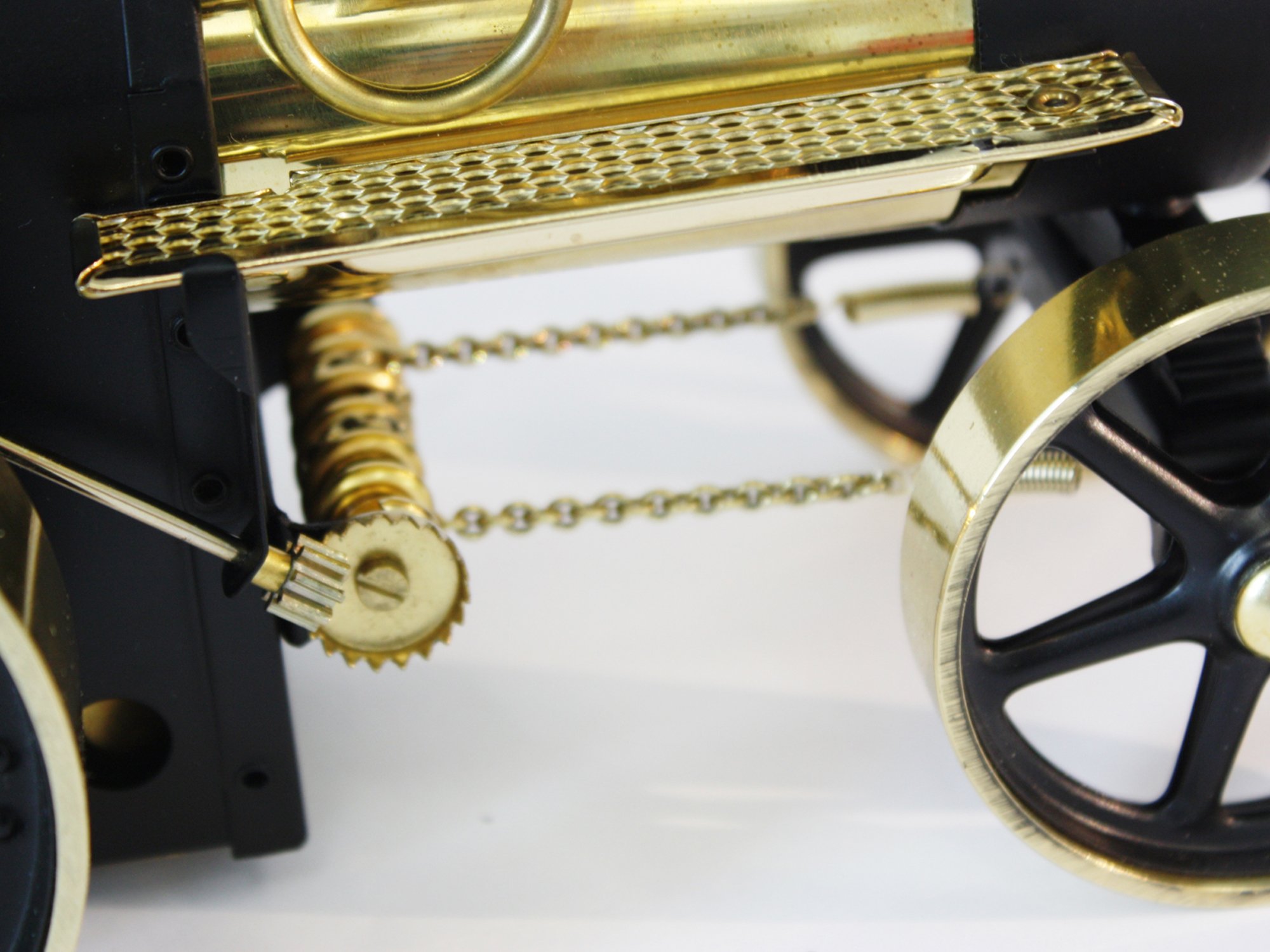 Le tracteur peut avancer et reculer grâce à un volant qui peut être démarré dans les deux sens de rotation. Le chaudron a un diamètre de 45 mm et une longueur de 185 mm, pouvant contenir 230 cm³. Le chaudron en laiton a été poli et nickelé avec soin. Le niveau d'eau associé est un verre d'observation invitant à regarder de près le fonctionnement de la machine à vapeur. Le tracteur a une direction à chaîne et une accouplement de transmission. Grâce à la boîte de vitesses à roue dentée débrayable, la machine à vapeur mobile peut également être utilisée en stationnaire. La durée de fonctionnement avec une charge de notre combustible sec Witabs est d'environ 15 minutes.