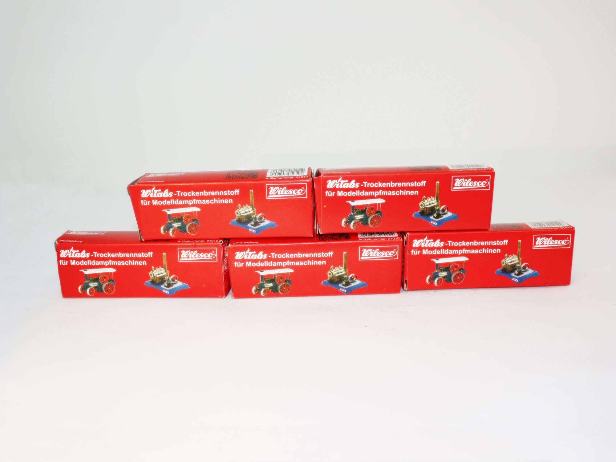 Der Trockenbrennstoff Witabs aus dem Hause Wilesco wird für die optimale Beheizung der Dampfmaschinen benötigt. Es handelt sich dabei um eine spezielle Eigenentwicklung, die gegenüber dem Trockenbrennstoff Esbit die folgenden Vorteile bietet: